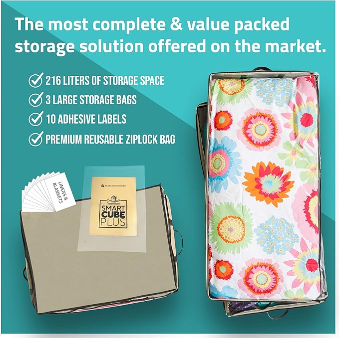 - STORE EVEN MORE – Hide away thick comforters or heavy winter clothes in your 3 Smart Cube bags of storage space! Spacious and durable, the 23x18x12 in. storage bags for clothes are perfect for larger loads.