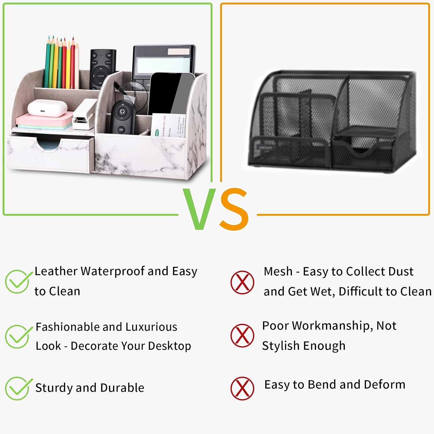 - ▶ STYLISH DESIGN AND STURDY CONSTRUCTION: The desk organizer surface is made of high quality PU leather with MDF struction, and designed with stitched detailing, interior and bottom are made of soft flannel.
