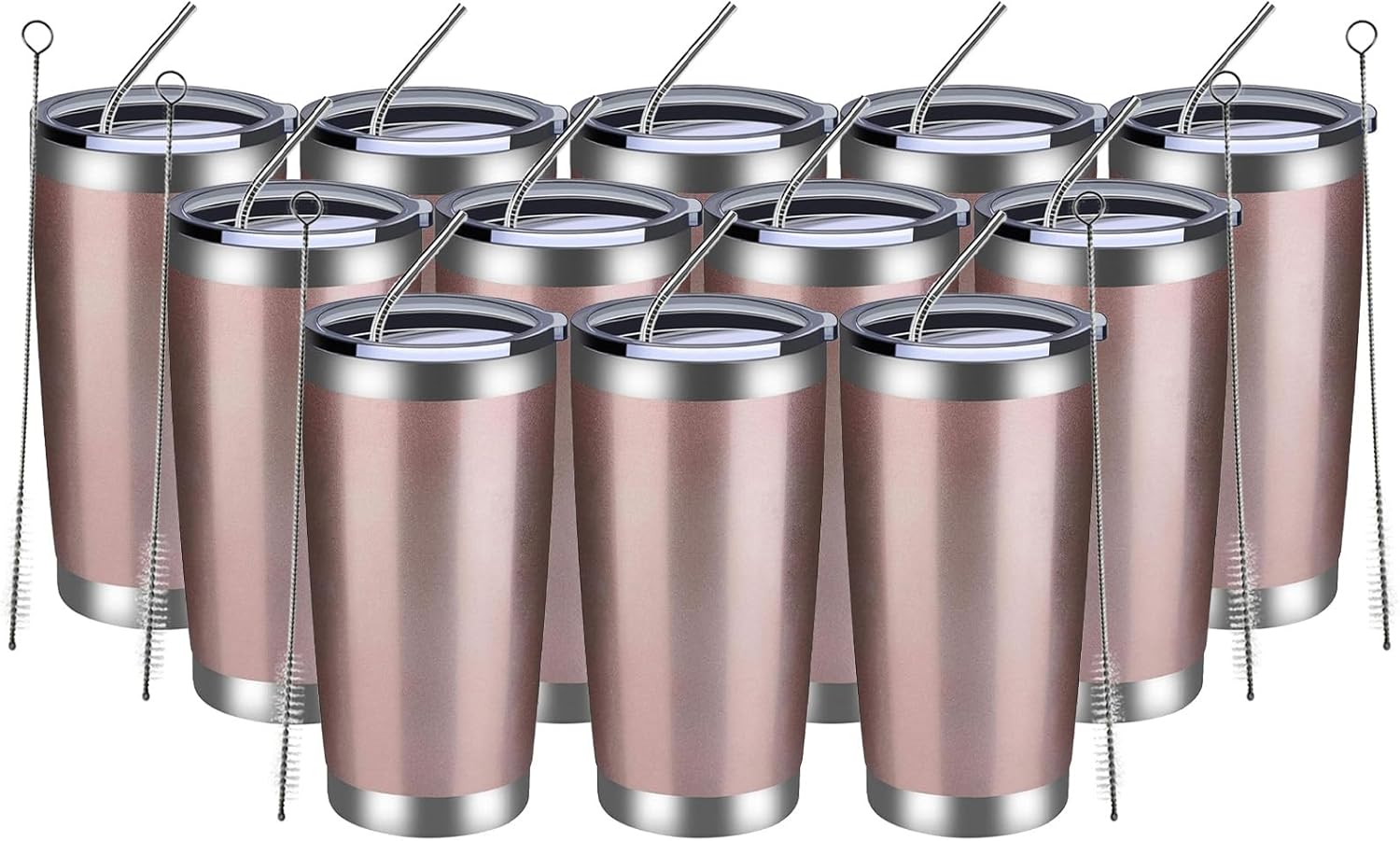MEWAY 20oz Tumbler 12 Pack Double Wall Vacuum Insulated Travel Mug Bulk, Stainless Steel Tumblers with Lid and Straw, Durable Powder Coated Coffee Cups for Cold & Hot Drinks (Rose Gold, 12)