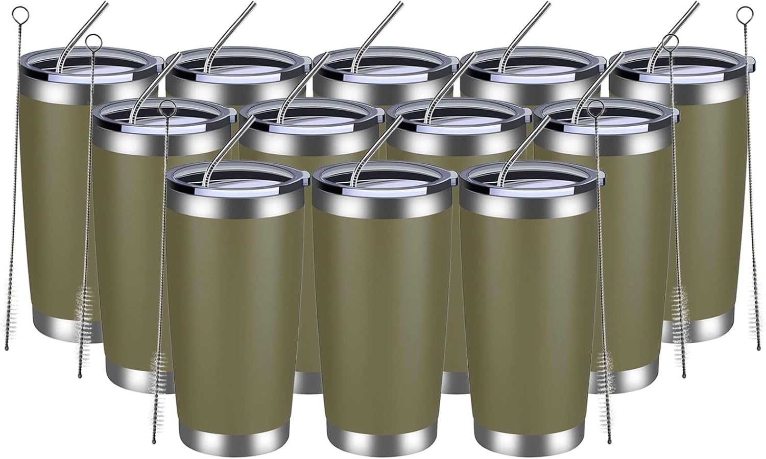 MEWAY 20oz Tumbler 12 Pack Double Wall Vacuum Insulated Travel Mug Bulk, Stainless Steel Tumblers with Lid and Straw, Durable Powder Coated Coffee Cups for Cold & Hot Drinks (Army Green, 12)