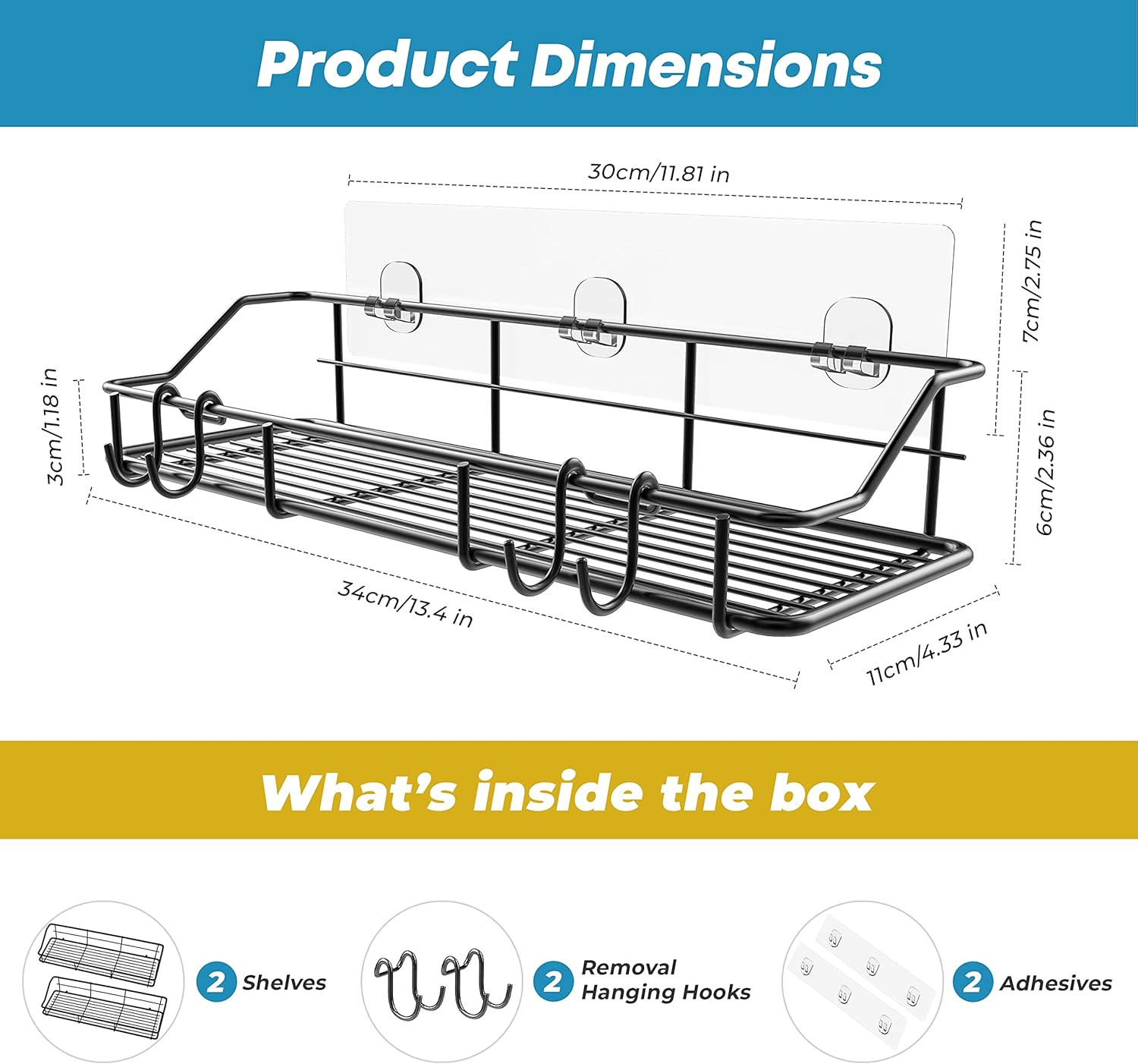 - What is included- 2 x Shower Caddies with Hooks, 2 x Transparent Adhesive Stickers, and 1 x User Manual.