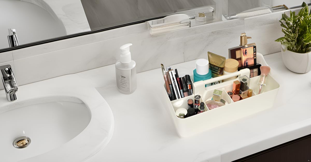New Plastic Portable Makeup Organizer Caddy Tote Divided Basket Bin with Handle, for Bathroom Storage - Holds Blush Makeup Brushes, Eyeshadow Palette, Lipstick - Extra Large Made In USA (Ivory)