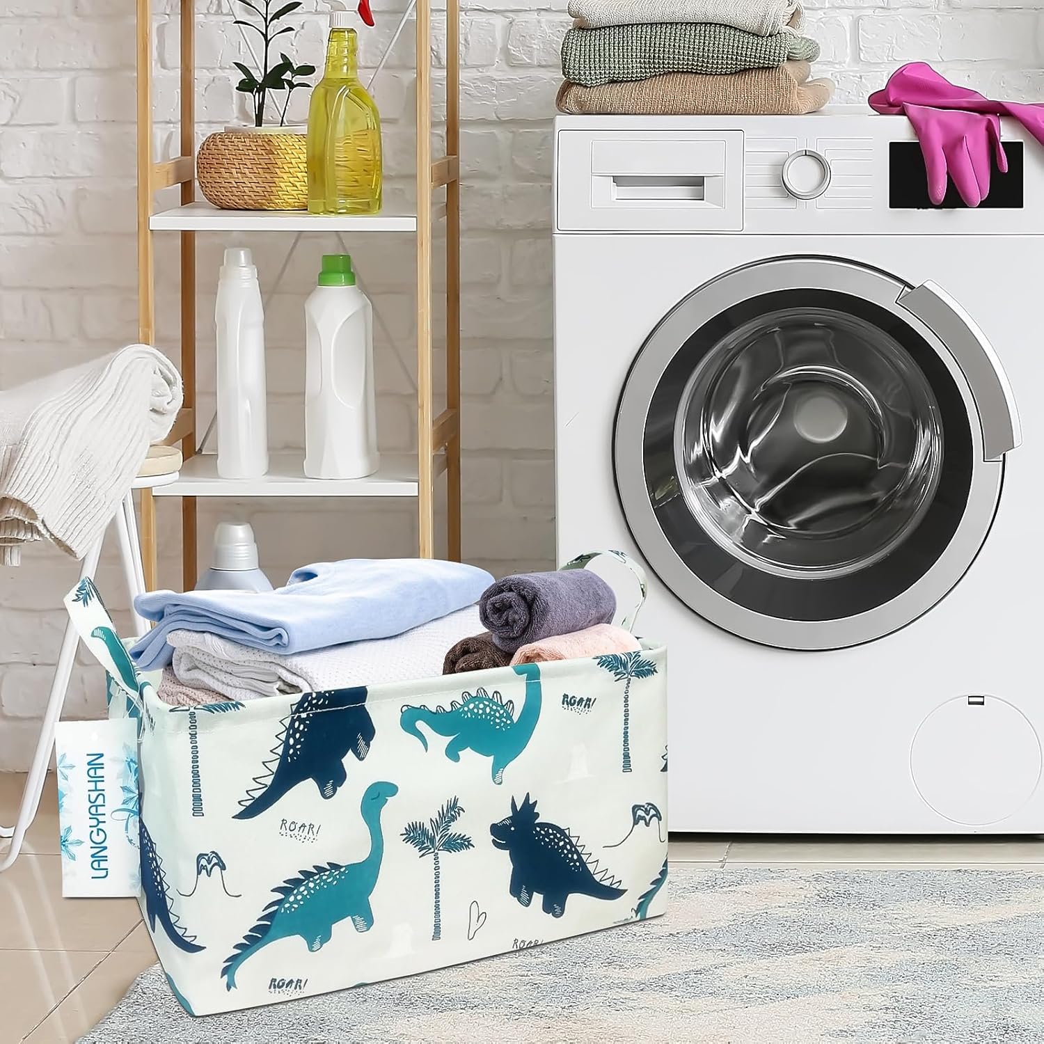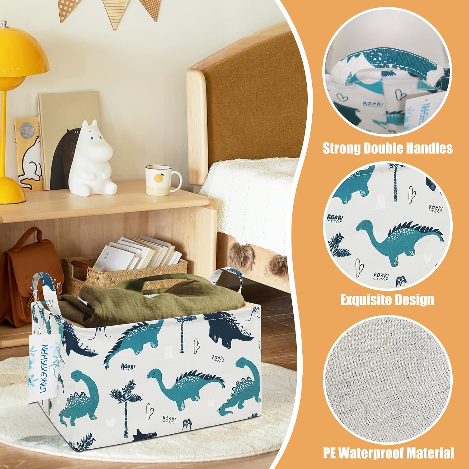 LANGYASHAN Rectangular Storage Bin Collapse Canvas Fabric Cartoon Storage Basket with Handles for Organizing Home Kitchen Boys and Girls Toys Office Closet Shelf Baskets (Rec green dinosaur)