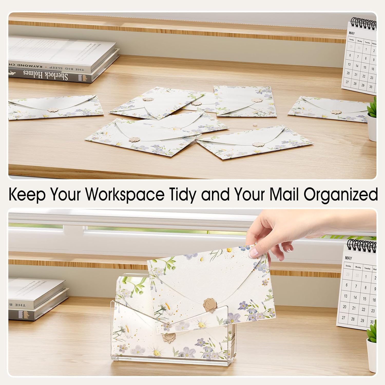 - Elegant and Functional - With stylish envelope-design and clear thick acrylic, the mail organizer allows you to instantly store and browse your letter, paper, business card, document, notepad. This acrylic clear mail organizer is functional in use and classic for home or office decor.