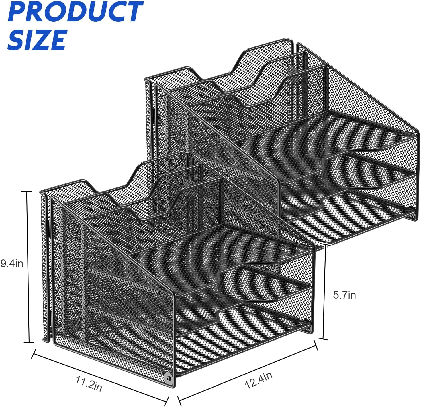 - Overall Size:12-1/4"W x 11-1/2"D x 9-1/2"H; each horizontal tray :12 x 11.4 x 2.7 inch(L x W x H);2 file holder:12 x 9.5 x 2 inch(L x H x W)