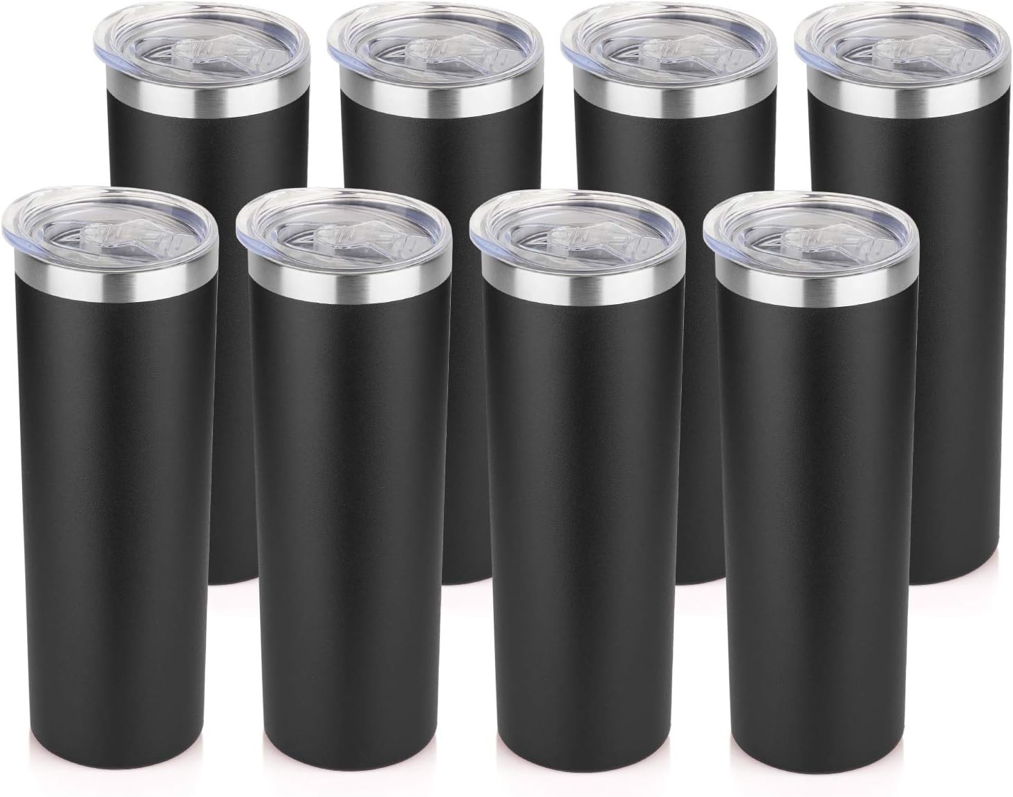HASLE OUTFITTERS 20 oz Skinny Tumblers Bulk Set, Stainless Steel Insulated Slim Tumblers with Lids, Reusable Double Wall Travel Coffee Mugs, Durable Powder Coated Travel Water Cups(Black, 8)