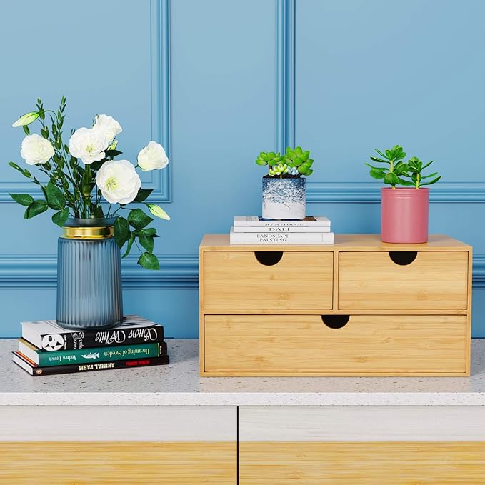 Wisuce Bamboo Desk Organizer - Mini Desktop Drawer Tabletop Storage Organization Box for Office Home Toiletries Supplies, No Assembly Required (3 Drawer)