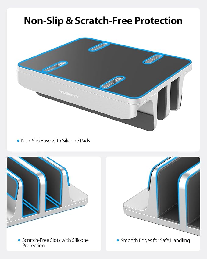 - 3-Slot Versatility: AboveTEK Vertical laptop stand 3 slot design accommodates two laptops (up to 17.3") such as MacBook, laptops, and notebooks, along with a dock for phones. This heavy duty laptop holder is suitable for a wide range of devices.