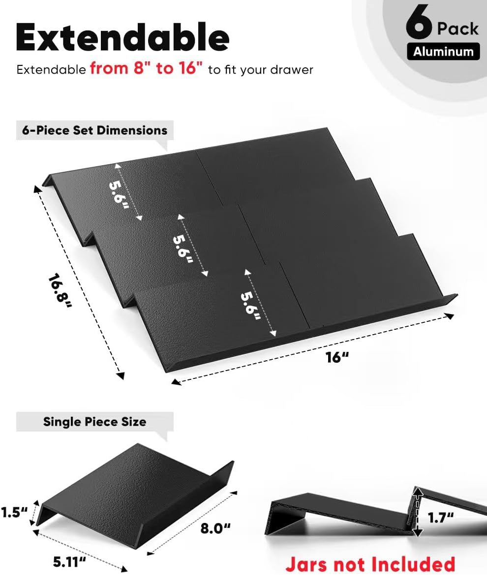 Artibear Expandable Aluminum Spice Rack Drawer Organizer for 8" to 16" Kitchen Cabinets Drawer Tray, Set of 6, Black