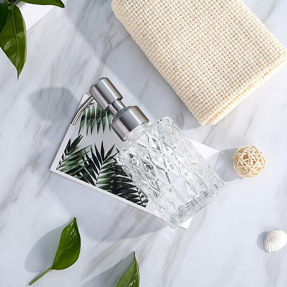 - Cut-Glass Dispenser: Stylish glass soap dispenser with pattern, perfect for soap, lotion, hand soap, dish soap, etc.