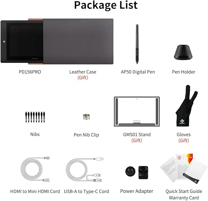 - 【Single-cable Connection】PD156Pro drawing monitor could be power by laptop directly with a single 3-in-1 cable.【Lightweight & Portable】Travel-friendly with 12mm in thickness and 2.87lb(1.3kg) in weight. Fordable monitor stand provides multi-angle for drawing and typing. Also come with a Gifted Leather Case to help protect the drawing pad while carrying it around.