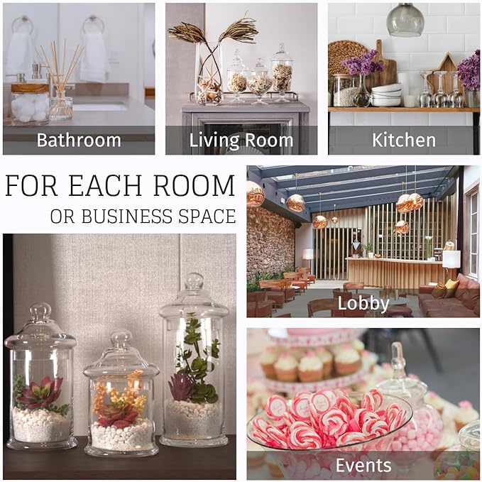 - SIMPLE AND GENEROUS DESIGNS: This candy jar with lid has a simple and generous design and glass bottles are sturdy high quality hand-blown from no lead glass. The set of 3 clear apothecary jars glass will bring a neat feeling to any room.