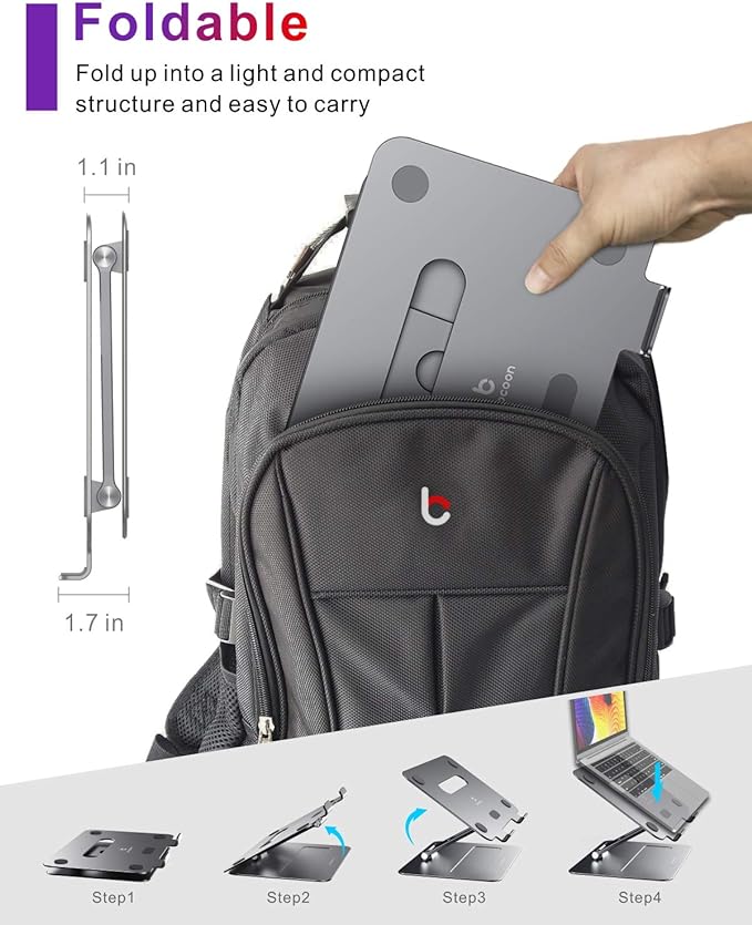 - Ventilated Cooling & Foldable: Macbook air stand with aluminum alloy material on top can absorb and discharge heat at ease. What's more laptop riser has heat vent design increase natural airflow help you laptop cooldown, hence running at optimal performance longer, and even prolonging the life of your laptop. This computer stand can easily fold and fit into your bag and laptop case.