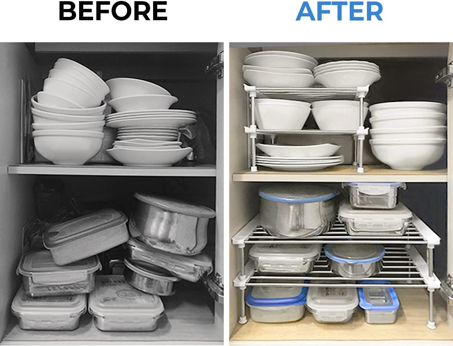 - Maximizes Space and is perfect for organizing plates, cups, bottles, and kitchen clutter. Creates storage space in your kitchen cabinets and countertop, bathroom and more.
