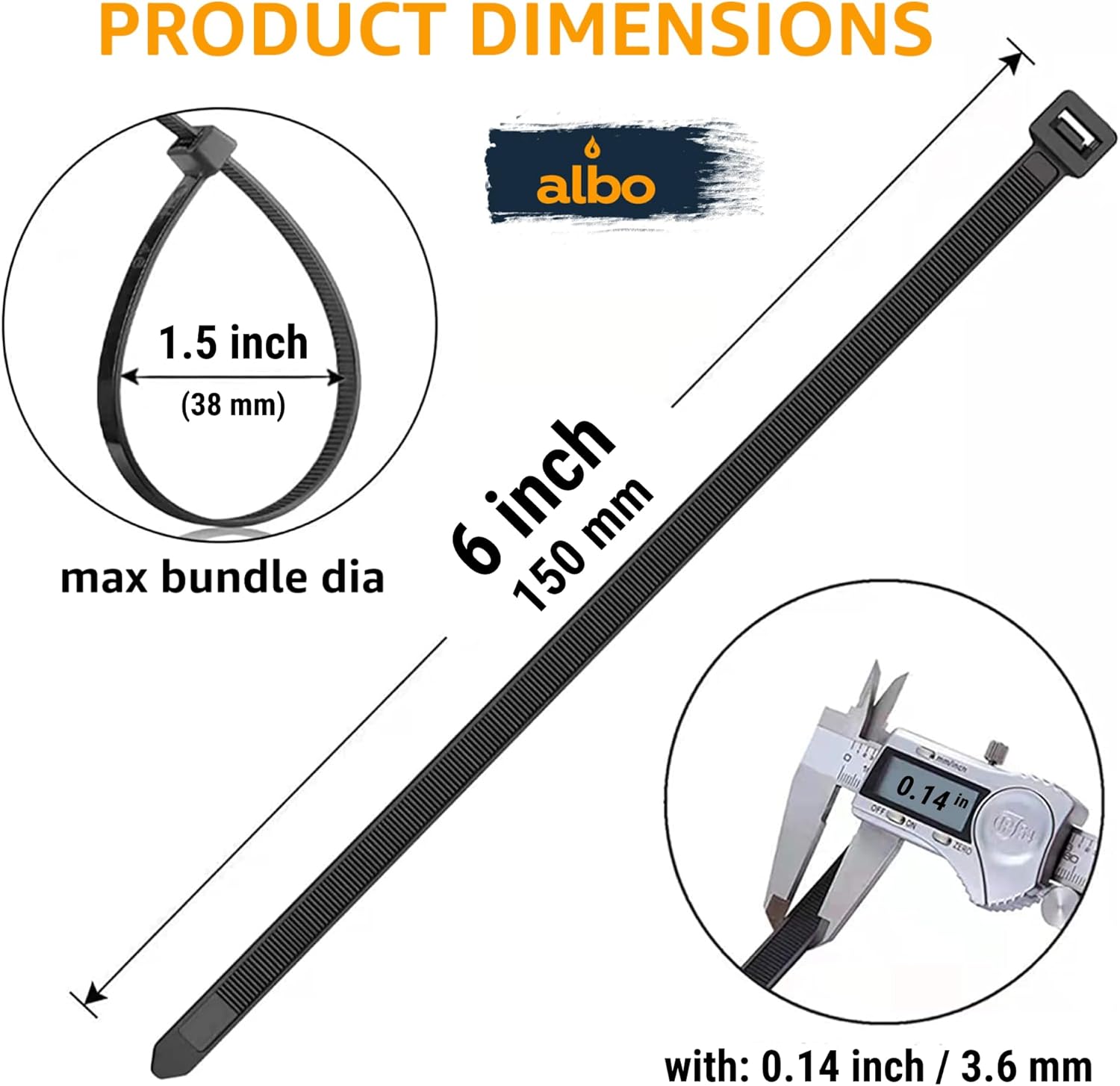 ALBO Zip Ties Black 6 Inch 1000 Pack 40 lb, Long Plastic Cable Ties Thick 0.14 Inch Tie Wraps Heavy Duty UV Resistant Nylon Wire Ties for Indoor and Outdoor
