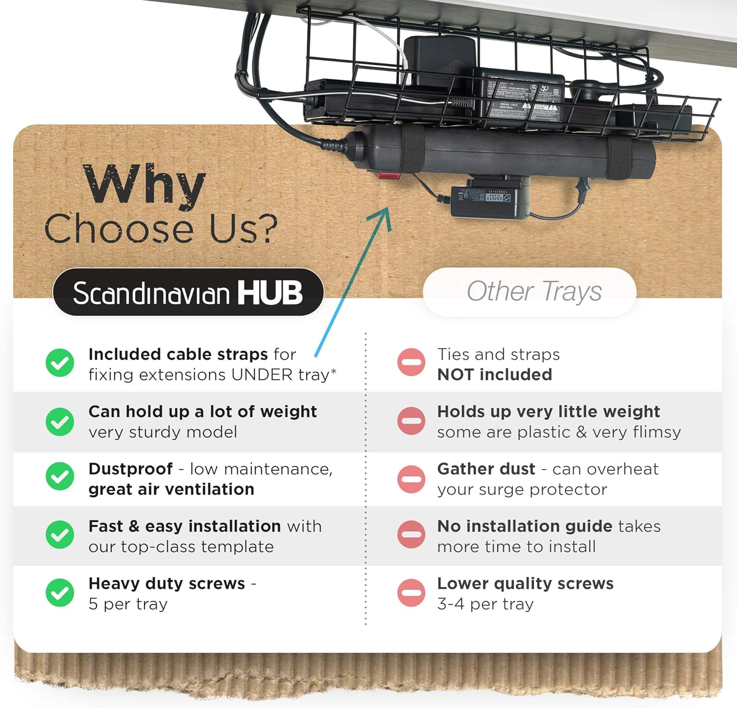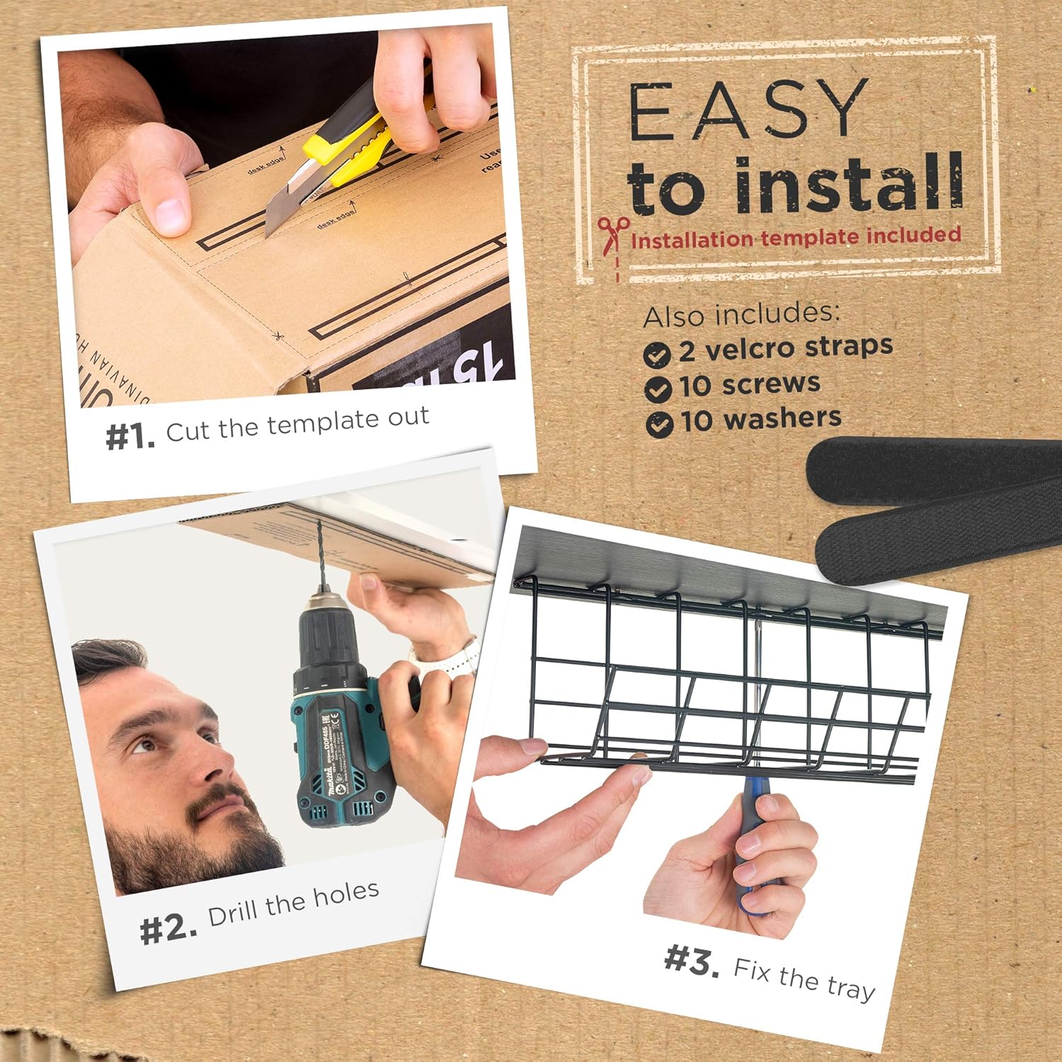 - Strong and Sturdy: Avoid messy hanging wires! This under table cable management kit has lots of space for cables. The under desk wire organizer is made out of steel, giving it sturdy construction. It is fully welded and powder coated for long life.