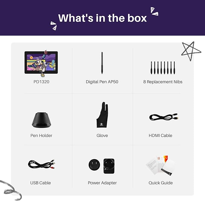- 【FULL-LAMINATED SCREEN DRAWING MONITOR & LOWEST PARALLAX】--With full-laminated tech applied on PD1320 Drawing Display Tablet, visually the parallax will be deduced to the lowest level.【120% sRGB COLOR GAMUT】--High color gamut ensures GAOMON PD1320 darwing tablet vivid images and beautiful colors. 【CONTRAST RATIO:1000: 1】【Wide Viewing Angle: 89°/89°(H)/89°/89°(V) (Typ.)(CR>10)】 【Display Area: 293.8 x 165.2mm(11.57*6.5 inches).】 【COLOR:16.7M(8bit)】【COLOR: GRAY】 【WITH AG-FILM PRE-APPLIED】