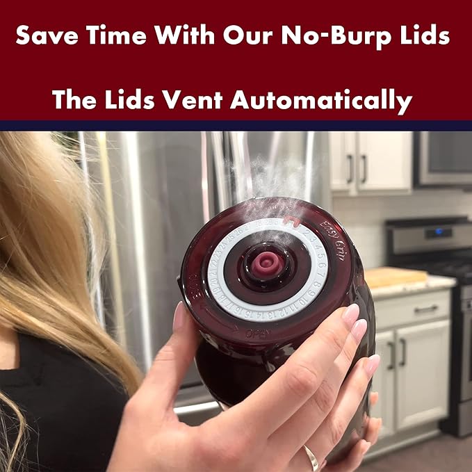 - Hassle-Free Waterless Fermentation Airlock Lids Are So Easy To Use: Our no burp value automatically releases gases and blocks oxygen so no burping of jars is needed; our fermenter lid is low profile and easily fits into cupboards