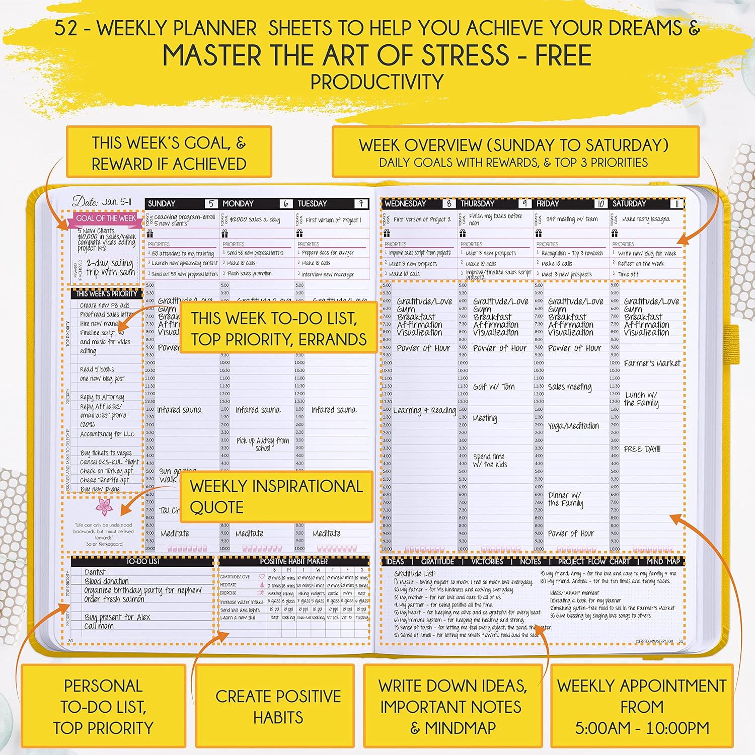 - INCREASE PRODUCTIVITY AND HAPPINESS - This is a deluxe life goal planner showing you how to become the best possible version of yourself on a mental, physical & interpersonal level using the law of attraction vibration guide. This planner is a daily planner, monthly planner, weekly planner, productivity planner, goal planner, business planner, to do list planner, planner notebook & gratitude journal all-in-one.