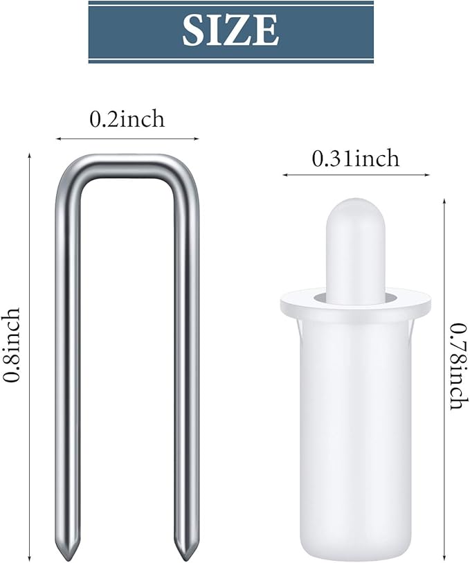 - Size detail: each louvers staple is approx. 5/8 x 3/16 inch in length and width, each shutter repair pin is approx. 0.8 x 0.2 x 0.1 inch, the recommended mounting pin hole size's dimension is 1/4 inch in diameter, and the diameter of the shutter is about 5/32 inch
