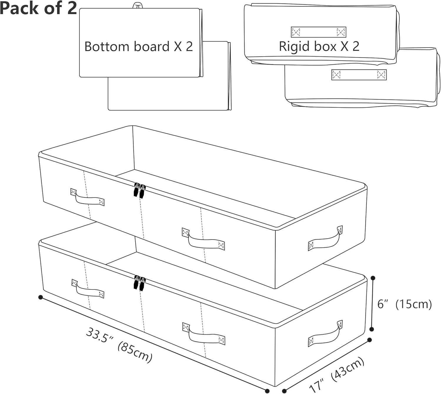 - Big space fits a lot of stuff and still hold shape-- the box size is 85*43*15cm(33.5*17*6"). The best organized solution of under bed, bench, TV stand,wardrobe, camper van for toys collection, garment, blankets, pillows, duvets, shoes organization.