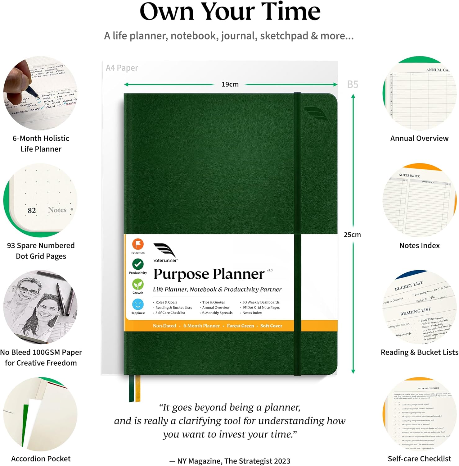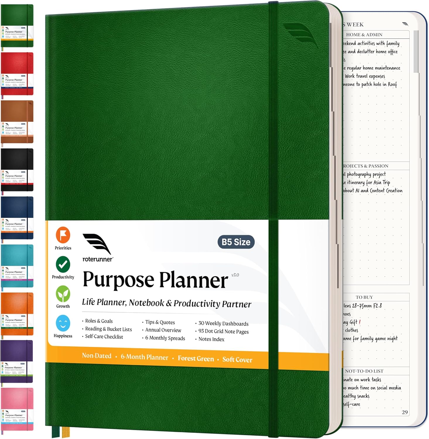 Roterunner Purpose Planner Notebook B5 7.5”x9.8” Undated 2026 Daily Weekly and Monthly Productivity Goal Setting Tool for Work Home ADHD Planner for Adults Self Care Journal