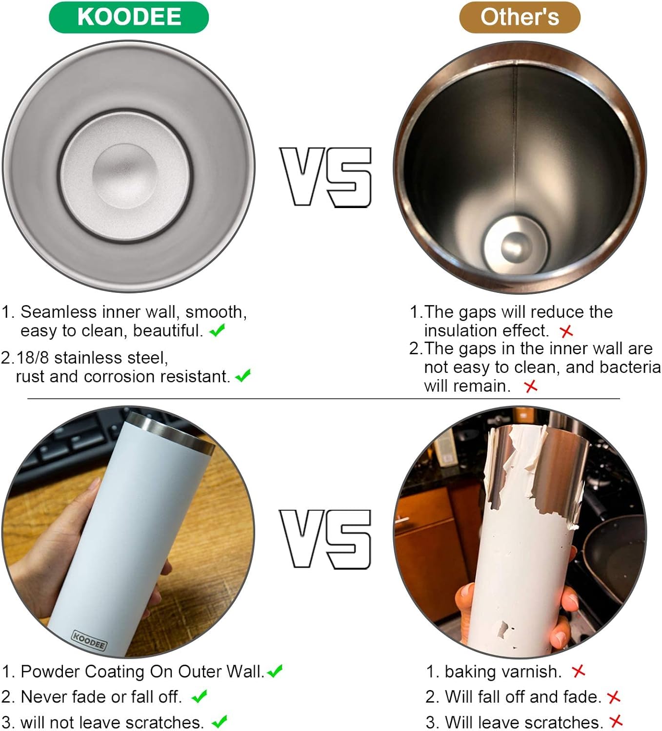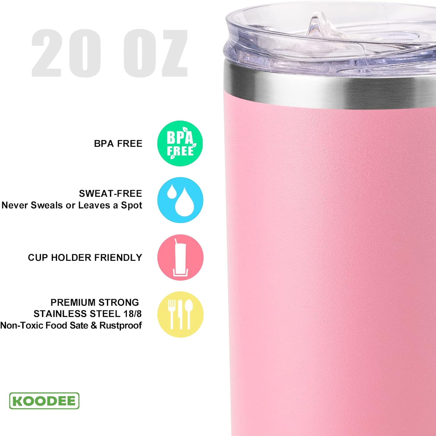 - 🍺Double-Wall Vacuum: KOODEE stainless steel skinny tumbler adopts double-layer vacuum heat insulation technology. Keep hot drinks for 12 hours and cold drinks for 24 hours. Vacuum technology makes the outer wall sweat-free, no matter what beverage you drink, you can keep your fingers dry and will not burn your fingers