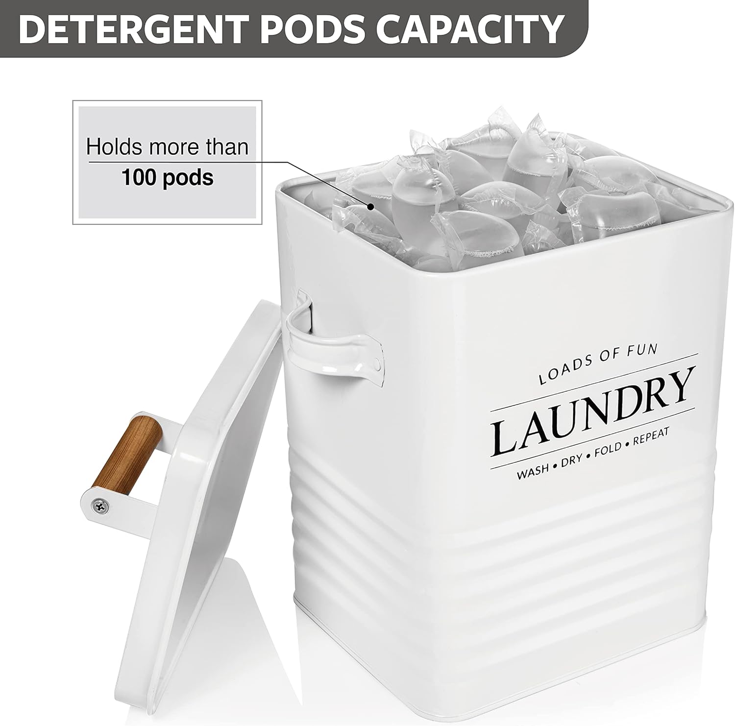 - MODERN FARMHOUSE DESIGN: Modern product design with a word ‘laundry‘ is printed on a farmhouse style laundry powder container with a wooden handle providing modern farmhouse touch to your laundry room. This laundry storage tin’s white color will blend seamlessly with any laundry interior scheme and is a wonderful alternative to cardboard laundry detergent boxes