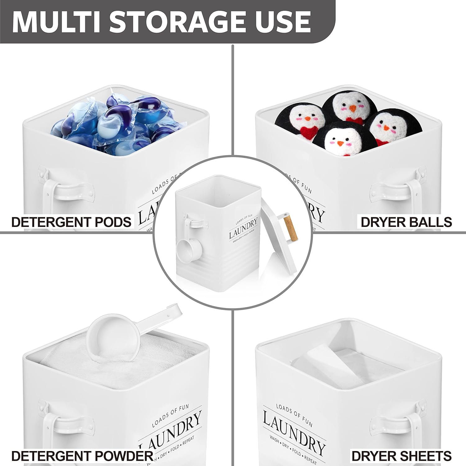 - MULTI-PURPOSE STORAGE TIN: Remember only a word ‘laundry’ is printed on this laundry storage tin. With that being said, why limit the purpose of this storage tin for laundry powder? This storage tin is perfect to store not only the laundry powder but detergent pods, dryer balls, dryer sheets, lint, and so much more