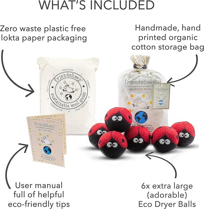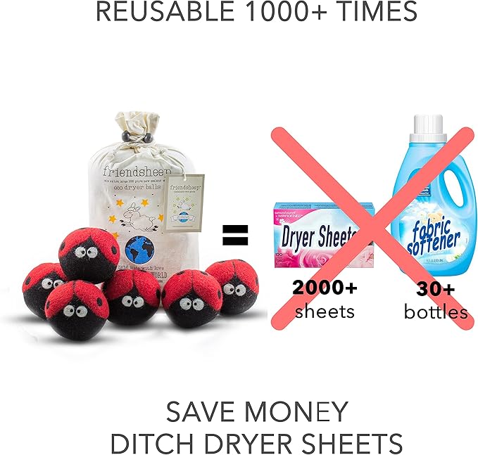Friendsheep Wool Dryer Balls, Organic Reusable Fabric Softener Alternative for Laundry, Handmade, Fair Trade, Hypoallergenic, Eco-Friendly, Plastic-Free (6 Pack XL – Ladybugs)