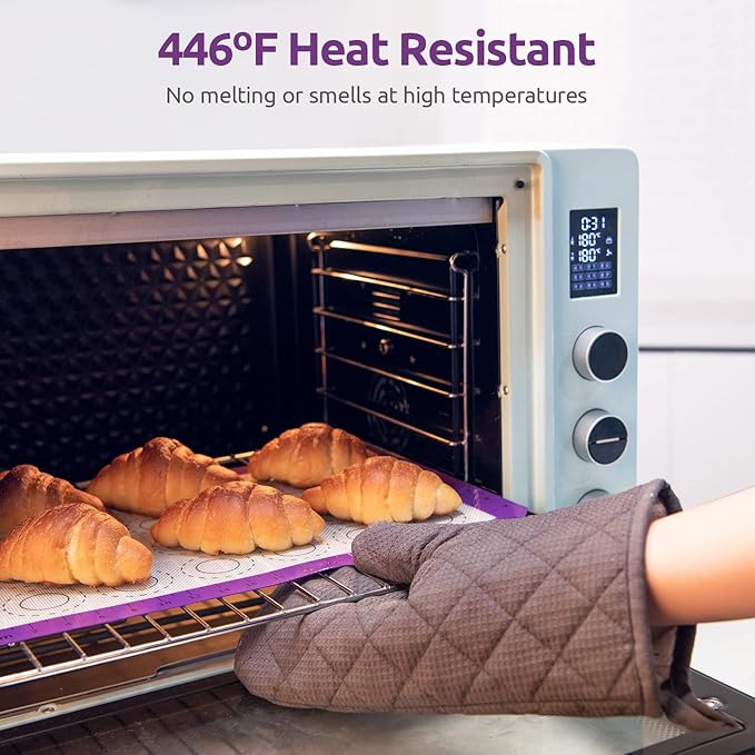 - [446ºF heat resistant feature] We use the food grade liquid silicone (the same material as baby nipple) to wrap fiberglass, which is more heat resistant and won't melt in your oven. Also no smells or smoke, meeting 9.83% buyers' needs. The inner fiberglass weave insures even heat distribution. Whether you are roasting veggies or making cookies, uneven doneness is no concern. You don't need to worry that your cookies burned on half of the bottom of them while not completely baked on top.