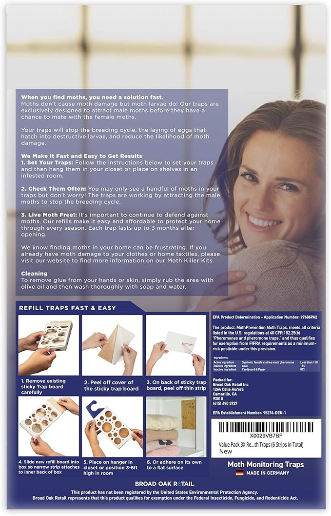 - LONG-LASTING PROTECTION – Our Moth Trap Refill 3x Twin Packs = 6 Strips in Total. For use in our MothPrevention Moth Traps. Each Refill provides 3 months of protection for your closet and precious clothing.