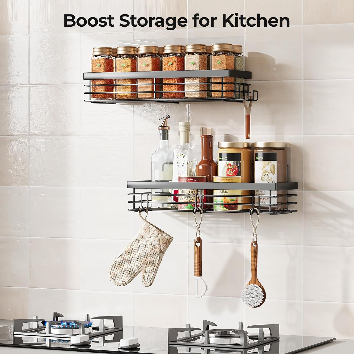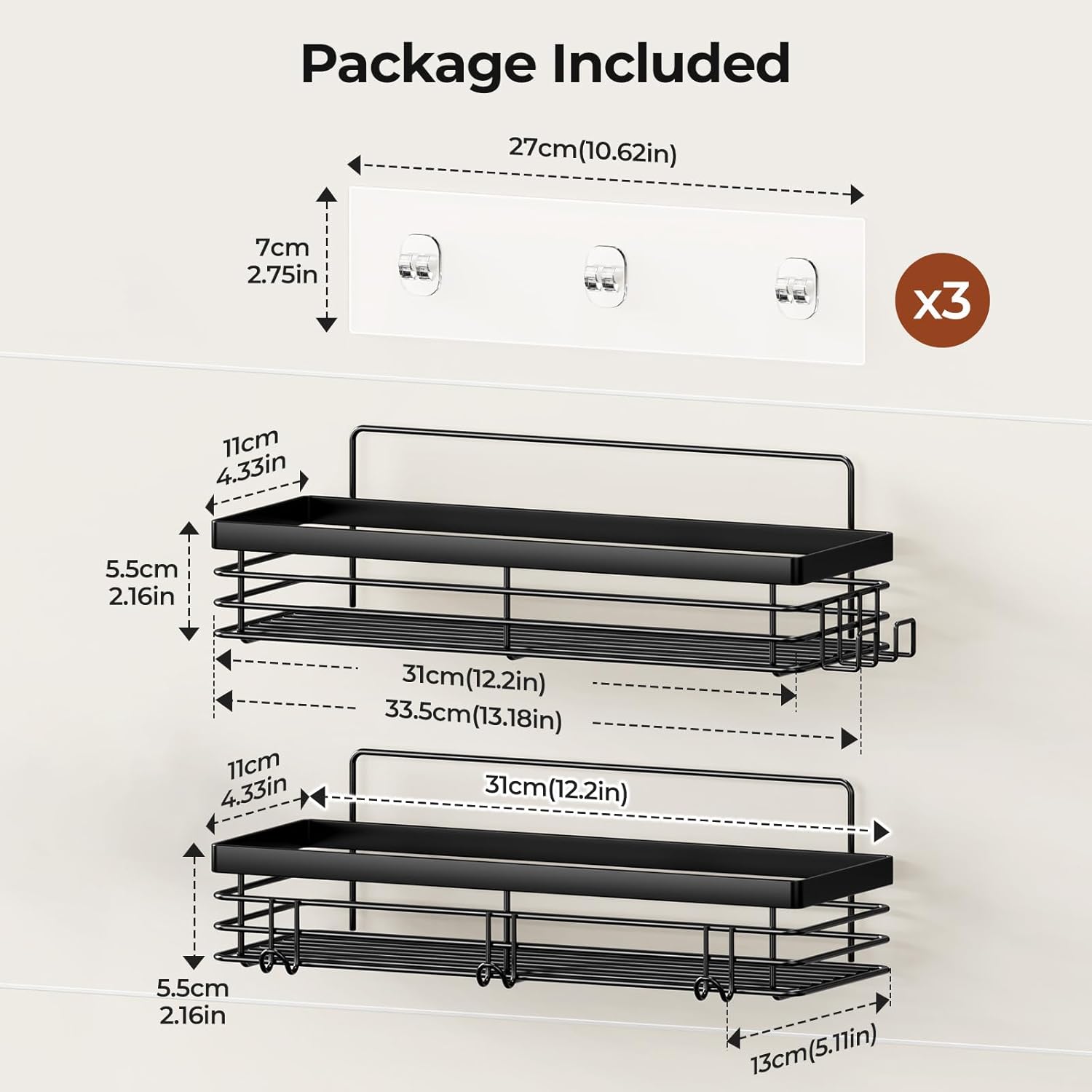 Orimade Shower Caddy with 5 Hooks for Hanging Razor and Sponge Adhesive Shower Shelf Basket Bathroom Storage Organizer Kitchen Rack No Drilling Stainless Steel Rustproof - 2 Pack,Black