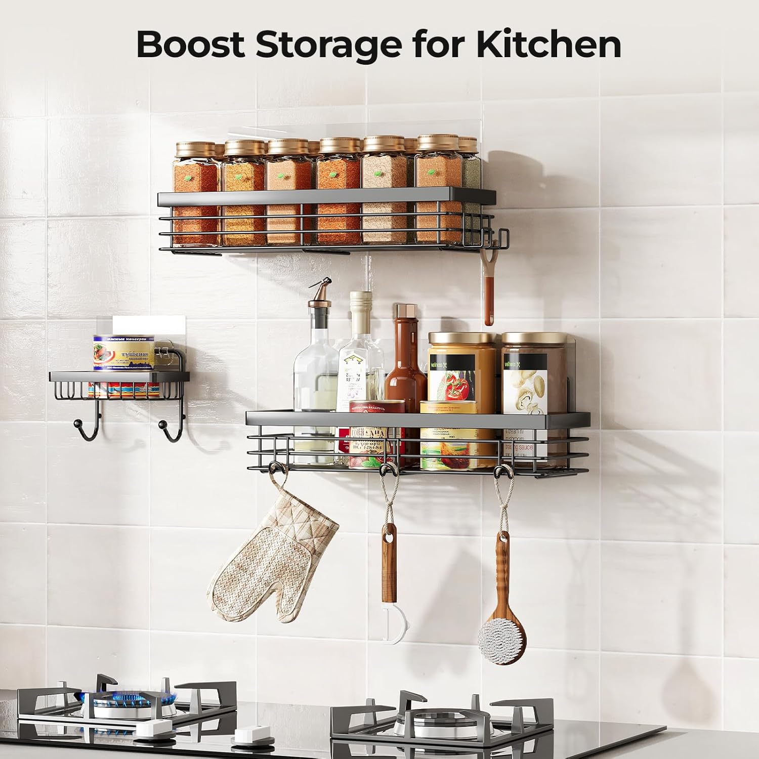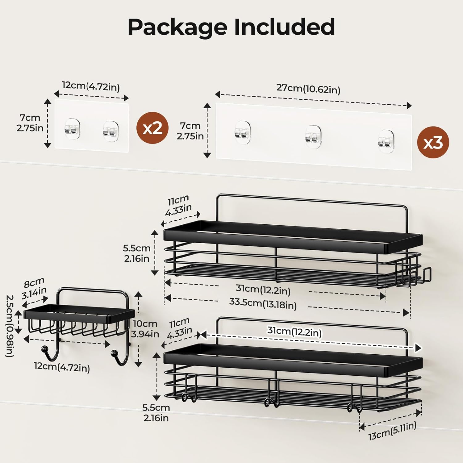 Orimade Adhesive Shower Caddy Soap Dish Holder Shelf with 5 Hooks Bathroom Organizer Basket Kitchen Storage Rack Wall Mounted No Drilling Stainless Steel - 3 Pack, Black