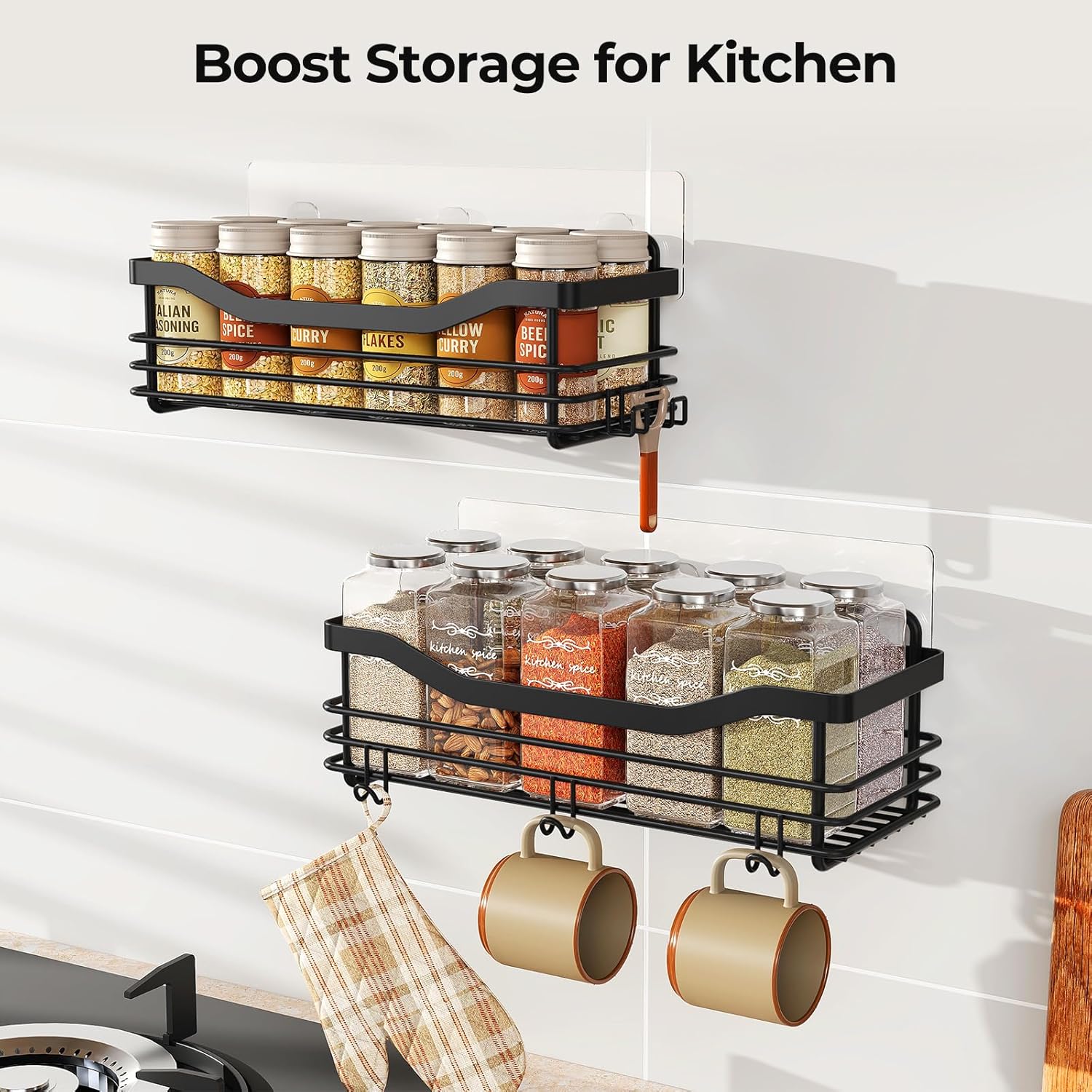 Orimade Adhesive Shower Caddy Shelf with 5 Hooks Organizer Storage Rack Rustproof Wall Mounted Stainless Steel No Drilling for Bathroom, Toilet, Kitchen - 2 Pack,Black