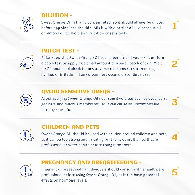 - Multi-Purpose: Sweet orange essential oil not only freshens the air and removes odors from the room, creating a clean and comfortable living space; it is often used in navel massage and aromatherapy to help relax, soothe and digest. Sweet Orange Essential Oil is also widely used in skin care and hair care, bringing a sense of freshness and helping to keep skin and hair fresh and smooth