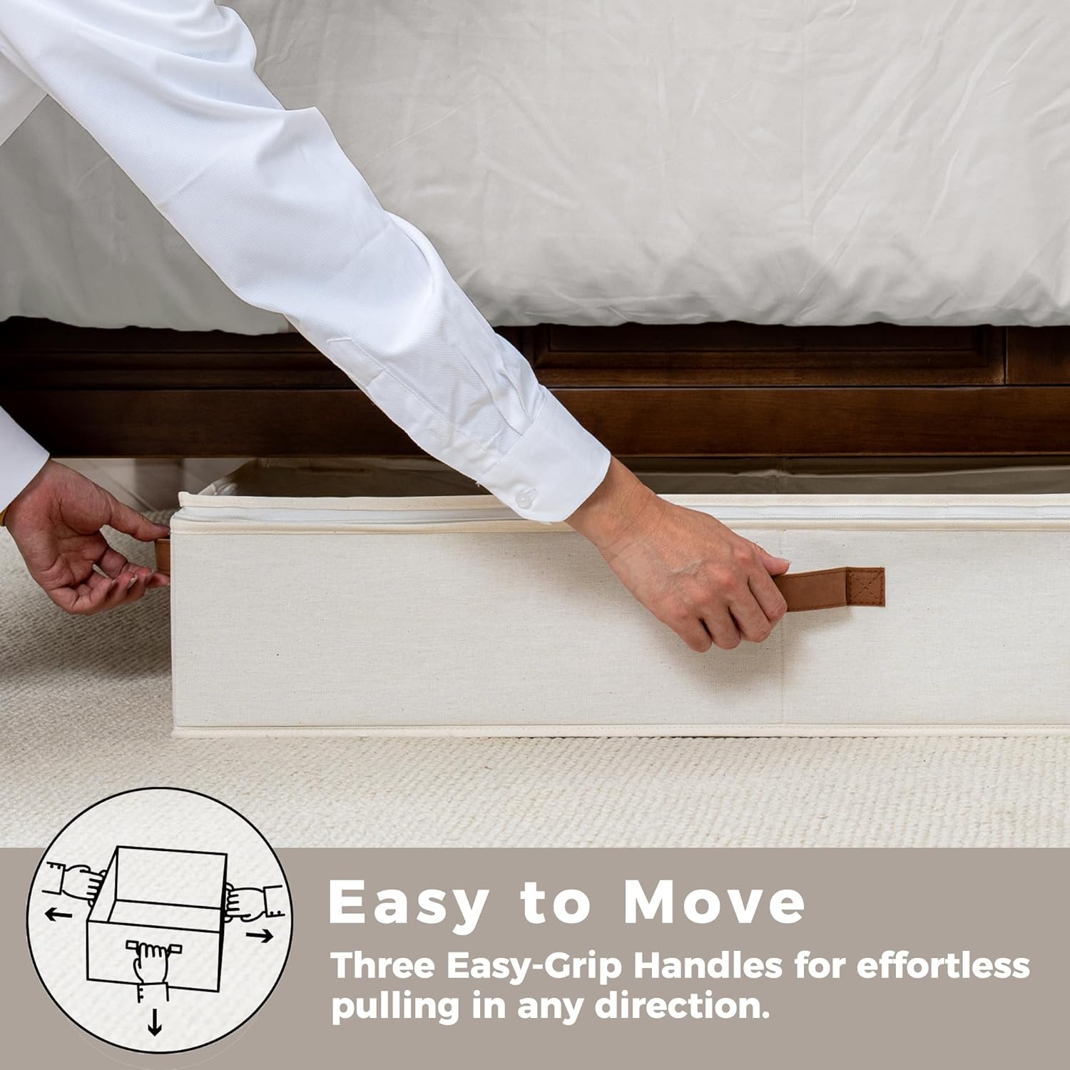 - Underbed storage box featuring thick PU handles on 3 sides for easy accessing, carrying, and retrieving.