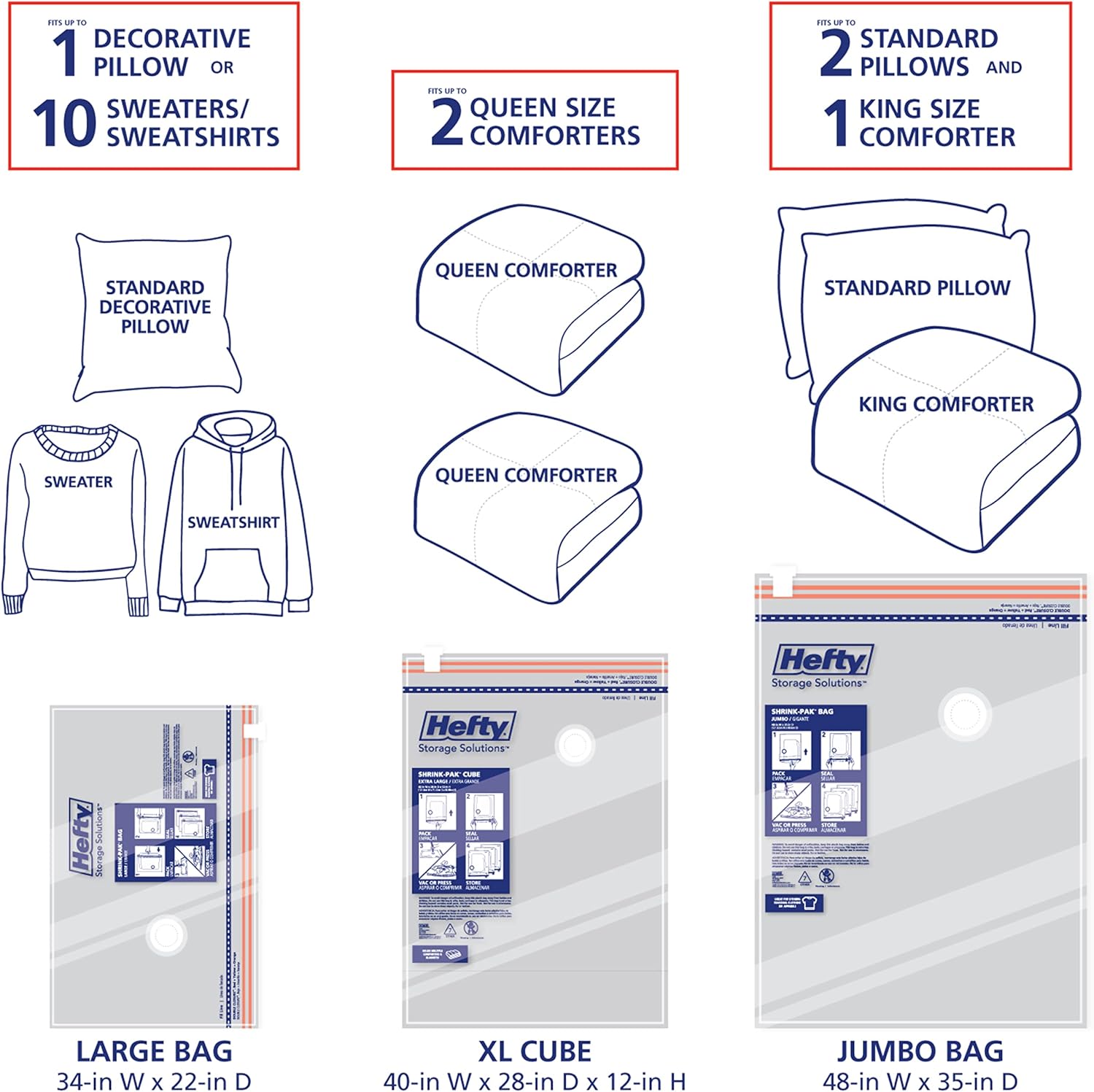 - Space Saving Storage Solution Starter Kit: Hefty SHRINK-PAK vacuum storage bags are the perfect storage solution for seasonal clothing and bedding, offering maximum shrinkage and effectively saving space in your closet, suitcase or under your bed