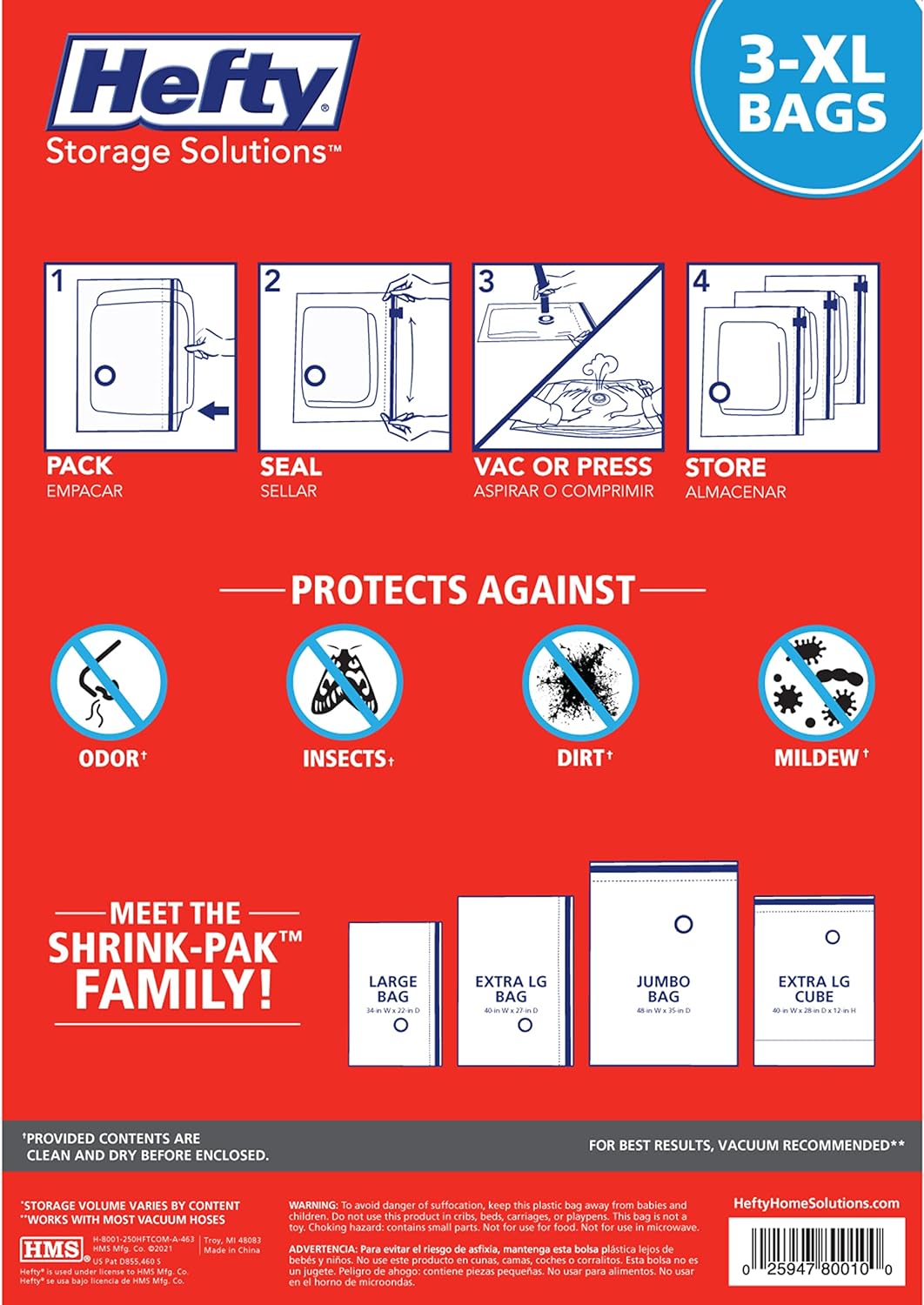 - Space Saving Storage Solution: Hefty SHRINK-PAK vacuum storage bags are the perfect storage solution for seasonal clothing and bedding, offering maximum shrinkage and effectively saving space in your closet, suitcase or under your bed