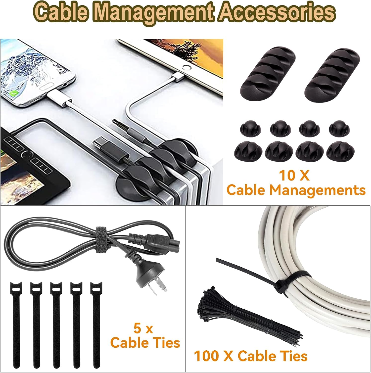 - 【7 Kinds Cord Organizer Kits 】--5 x Cable Ties, 100 x Cable Zip Ties, 20 x Adhesive Cord Holders(5 different kinds) . Boasting strong self-adhesive sticky pads ensuring they remain affixed to your desired. Neat cable cord holder will help those cluttered cables and cords around your desk, TV, power strip, computer much nicer, and safer.