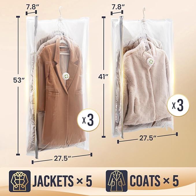 - Size of Vacuum Storage Bags: 3 LONG ( 53x27.5x7.8 in ), 3 SHORT ( 41.3 x27.5x7.8 in ) Each Space Saver Bag has 5 Hanging Rings, can store at least 5 thick winter coats/ suits at the same time