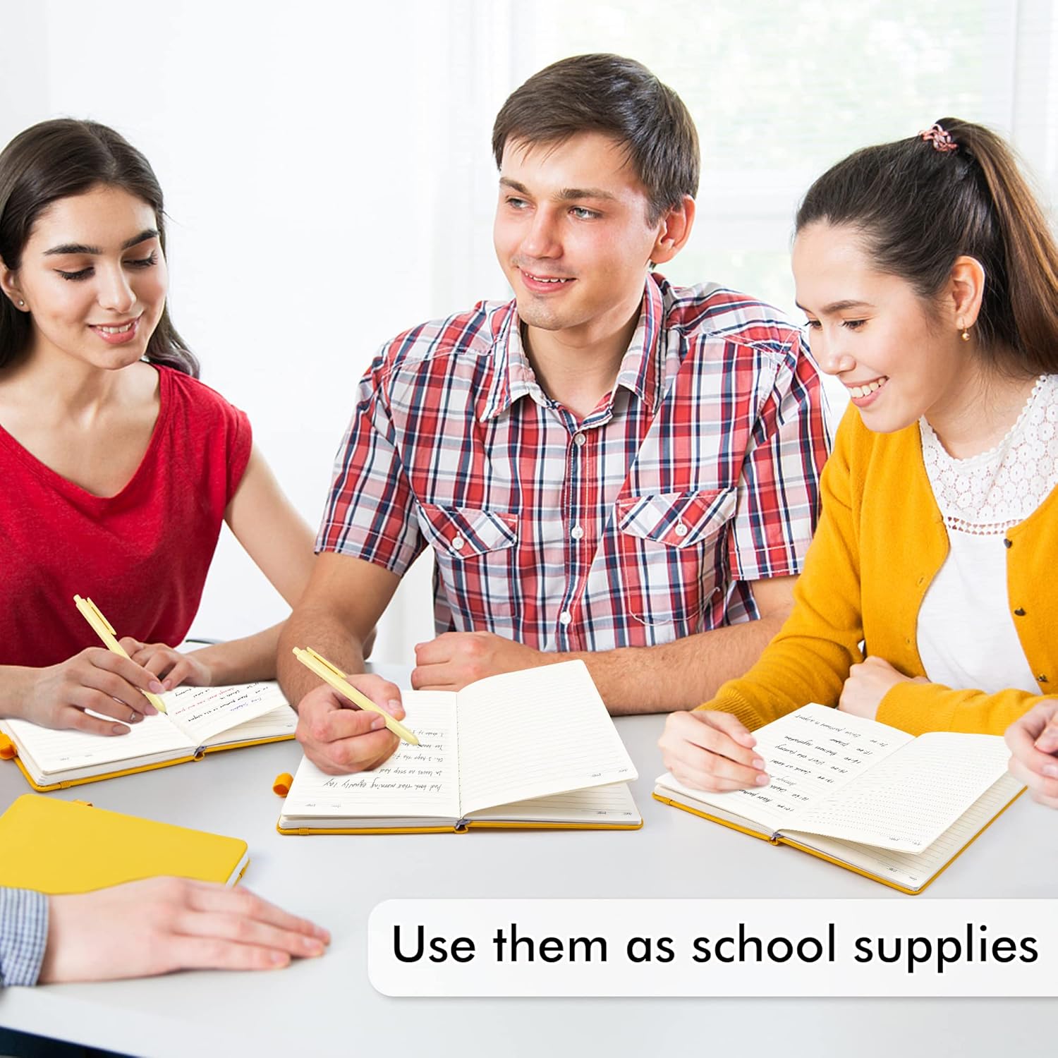 - Feela 24 Pack Classic Ruled Notebooks contains 24 classic yellow ruled sturdy cover notebooks and 24 Black Retractable Pens. Each of the notebooks measures 8.3” x 5.1”, which is perfect to carry and easily held by young girls and boys. These black cute pens are customized to be placed in the pen holder, which is pretty convenient.