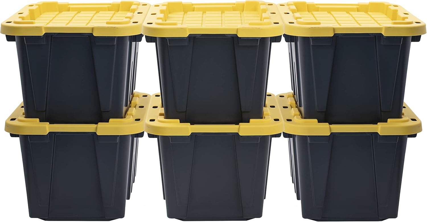 CX BLACK & YELLOW, 12-Gallon Heavy Duty Tough Storage Container & Snap-Tight Lid, (12.51"H x 16.3"W x 21.8"D), Weather-Resistant Design and Stackable Organization Tote [6 Pack]