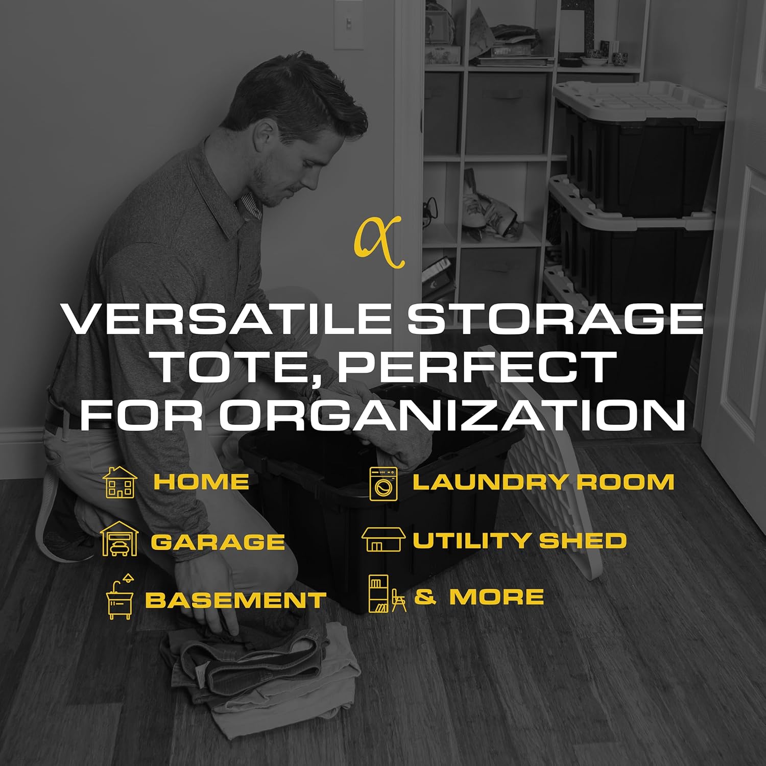 - ORGANIZATION: Save room and maximize space with the BLACK & YELLOW 12-Gallon Storage Container. Its the perfect way to organize any room and manage any clutter. Clean up any space whether its in a bedroom, closet, under the bed, garage, basement, laundry room, attic, workshop, shed, or anywhere else. The innovative lid is recessed, making it easy to stack multiple containers on top, and nesting them together.