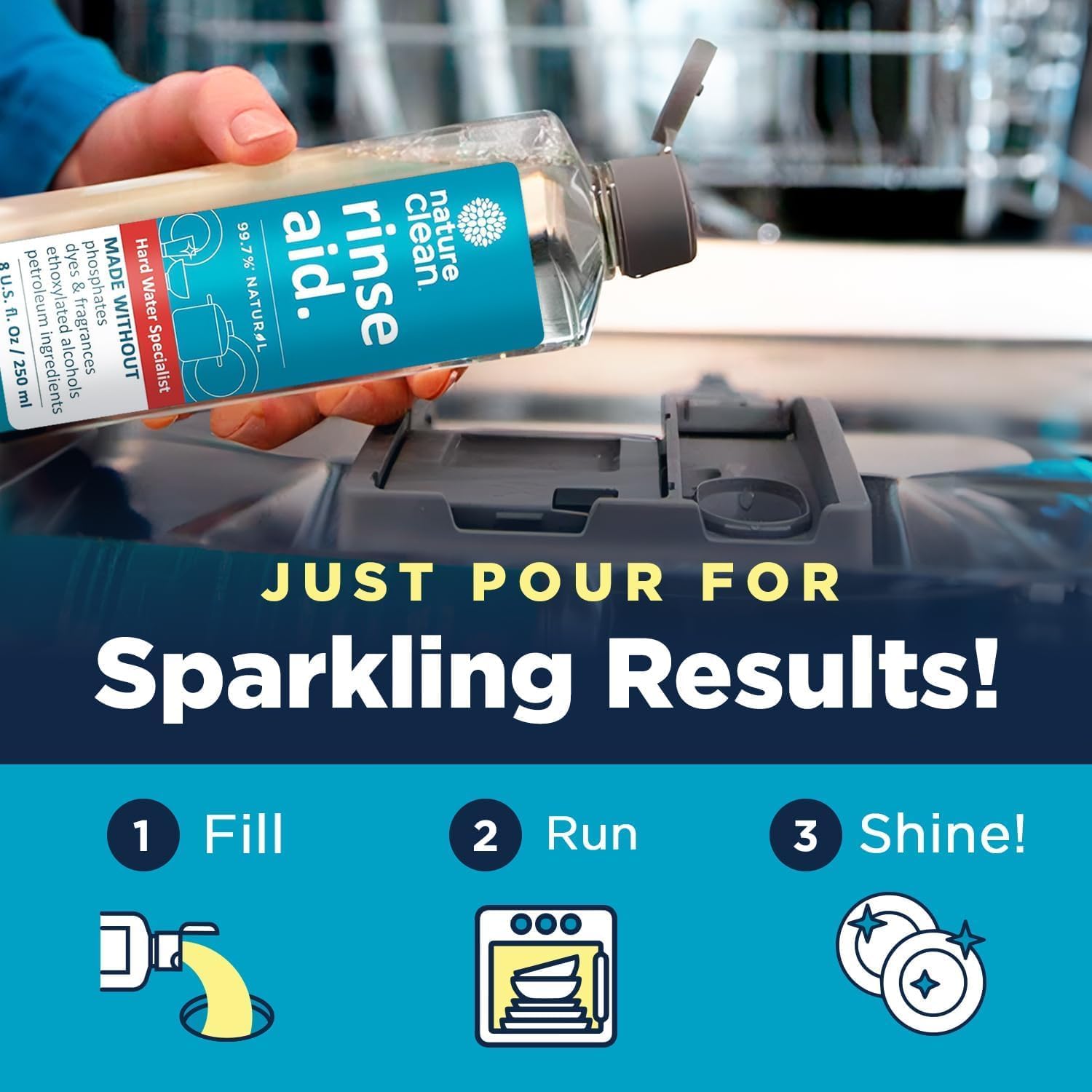 Nature Clean Natural Dishwasher Rinse Aid Liquid, Plant-Based Dishwasher Drying Agent with 99.7% Natural Ingredients, Unbelievable Power and No Nasty Chemicals. Hard Water Stain Remover. 8 oz 2-pack