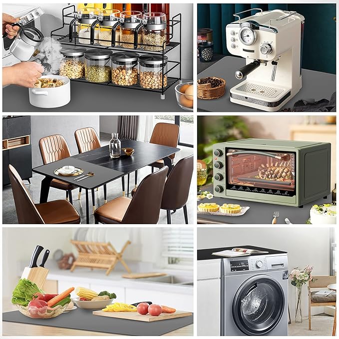 - You Can’t Go Wrong with It: This placemat can solve multiple problems. Great for catching messes. Protect counters from spills, scratches, grease, coffee stains, or damage. Place hot items of all sizes directly on the mat without having to dig through the drawer for a hot pad and no more need for trivets. Reduce the noises made by appliances. No need to worry about items slipping off the countertop. Tools will keep in place. Even if you are rolling dough hard on it, the mat won't slide