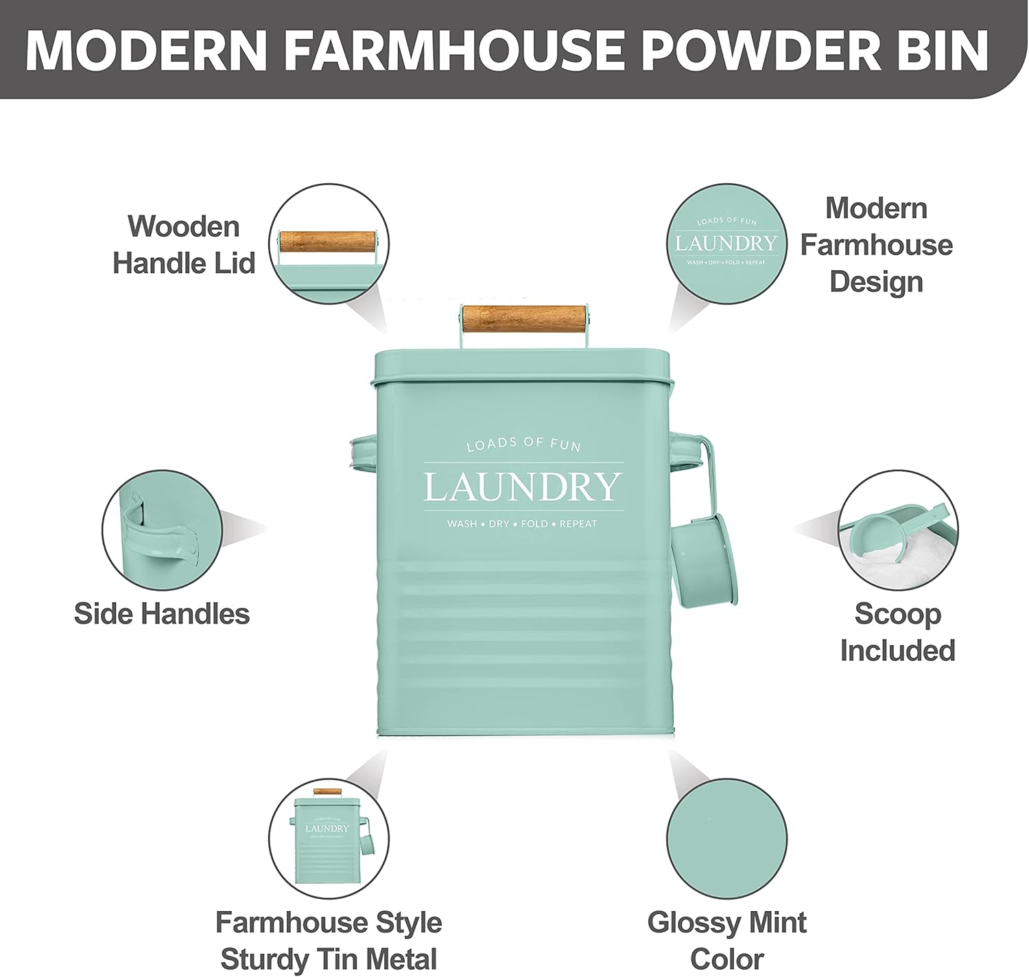 - MODERN FARMHOUSE DESIGN: Modern product design with a word ‘laundry‘ is printed on a farmhouse style laundry powder container with a wooden handle providing modern farmhouse touch to your laundry room. This laundry storage tin’s mint green color will blend seamlessly with any laundry interior scheme and is a wonderful alternative to cardboard laundry detergent boxes