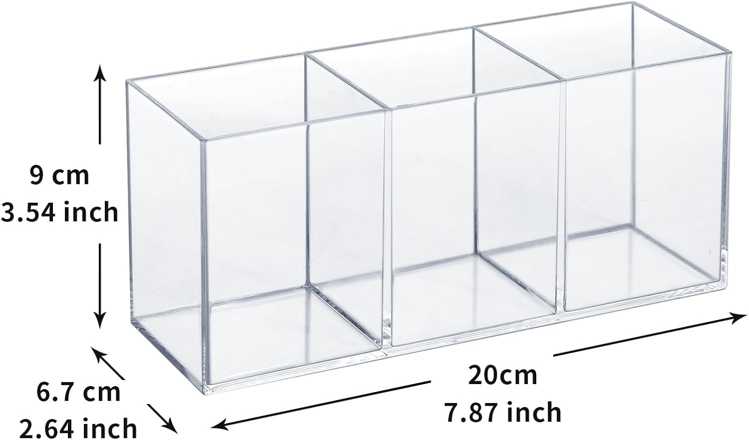 - Compact Size, Ample Capacity: Measuring 7.8” L x 2.56” W x 3.54” H, this acrylic caddy offers plenty of storage space without consuming your desk or counter. Its compact footprint fits nicely on any workspace – whether on a small dorm desk, a crowded kitchen countertop, or a bathroom shelf. (Approx. 19.7 x 6.5 x 9 cm in metric.) Despite its small size, the three sections can hold dozens of pens, pieces of flatware, or makeup tools, keeping your space clutter-free.