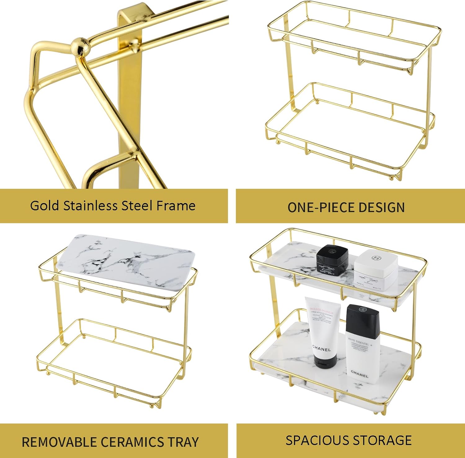 - EASY TO CLEAN: With a sturdy stainless steel frame that can prevent corrosion in wet places and removable ceramic trays with a luxurious marble pattern, this dresser top stand is both functional and easy to clean.