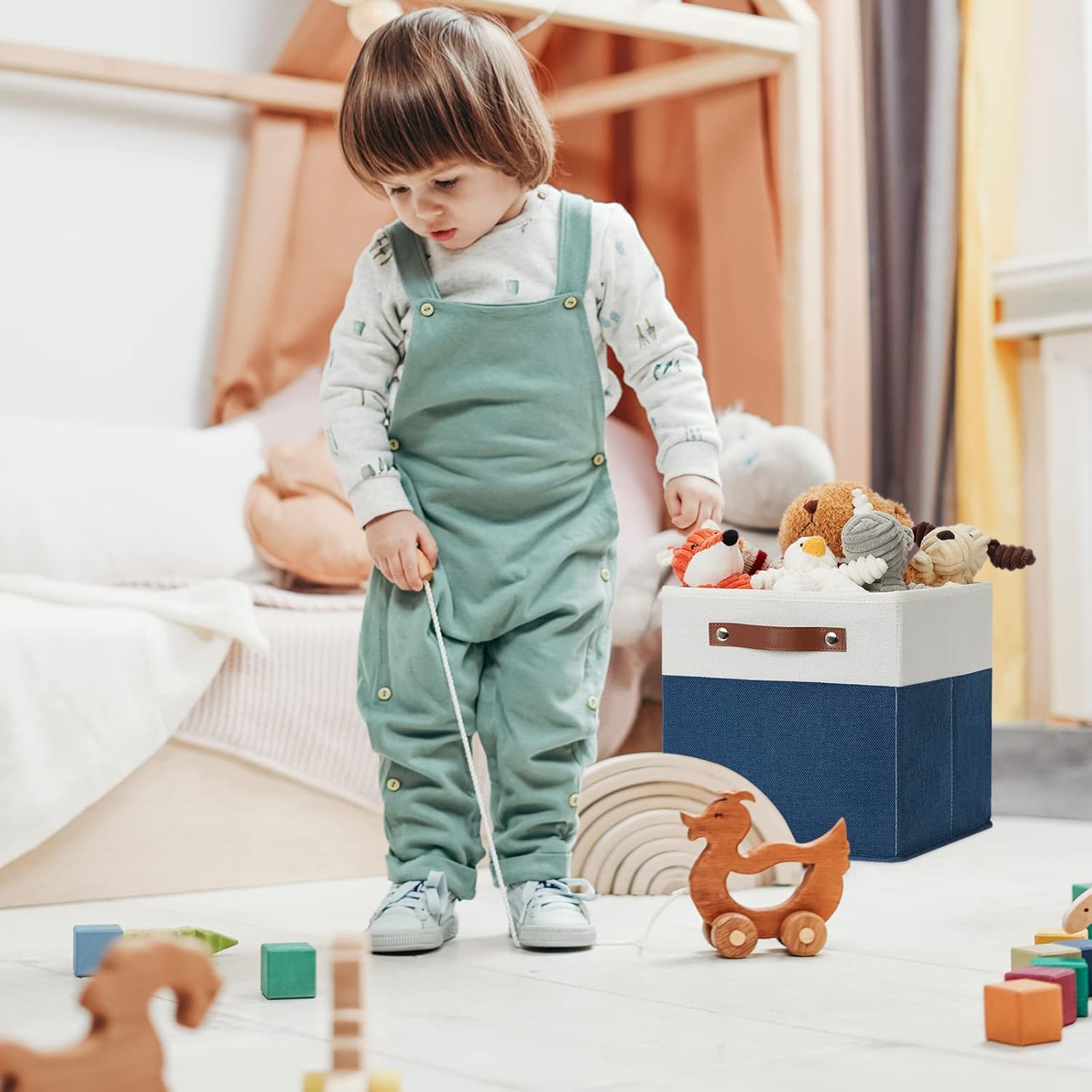- 【Material】These cube storage bins are constructed of sturdy and attractive linen & EVA with linen interior lining. The sturdy leather handles make it easy to carry or pull off and out of shelves.